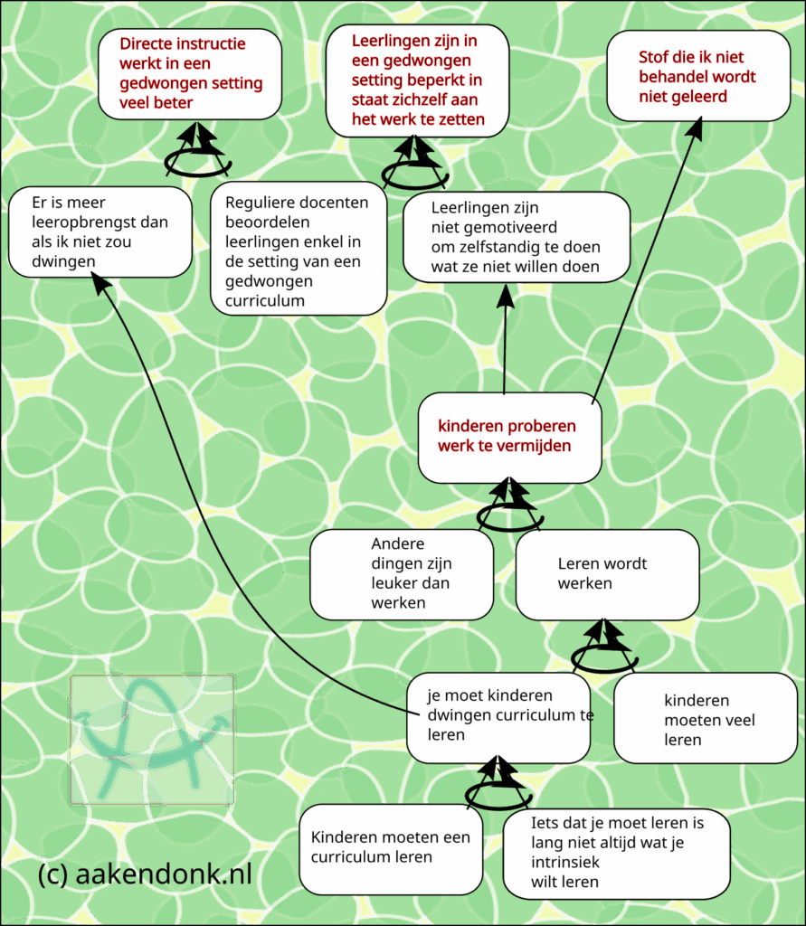 Ook het laatste punt is eenvoudig te linken aan het eerste deel van de deductie. Zie afbeelding, rechtsboven. Deze deductie lees je van onder naar boven. Het kernprobleem staat per definitie onderaan. Goh, is het kernprobleem een opgelegd curriculum….?